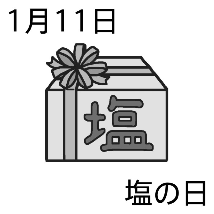 塩の日(モノクロ)/1月11日/今日は何の日?〜記念日イラスト素材〜 こちらの画像をDLして下さい。縦・横同じ比率で縮小して、お好きな大きさでお使い下さい。 縮小以外のあらゆる加工は禁止です。イラスト部分だけを切り取って使うなどの行為は絶対やめて下さい。 このイラストは印刷専用の画像です。web素材ではご利用頂けません。